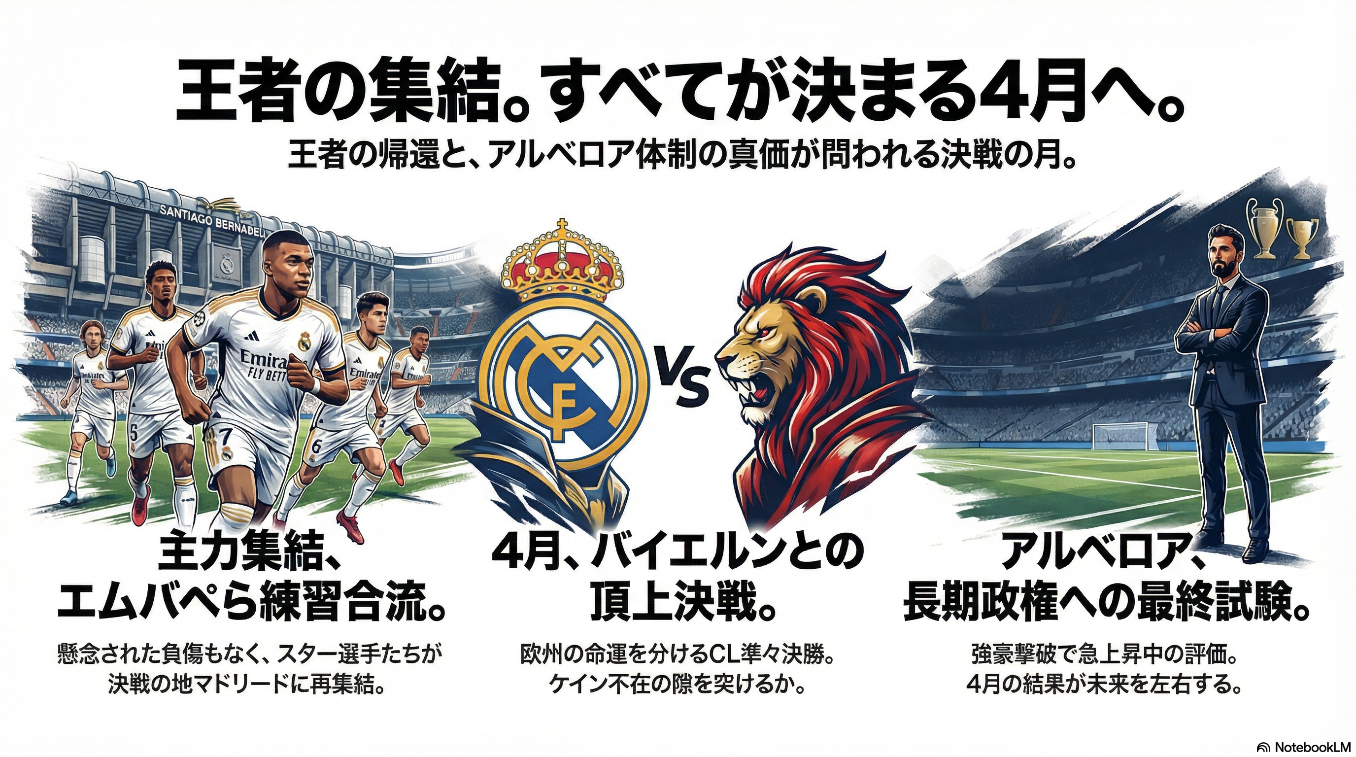 過密日程を迎える中、負傷者の復帰やアルベロア監督の采配、そしてチャンピオンズリーグでのバイエルン戦に大きな注目が集まっています。フェデ・バルベルデの赤裸々な告白やエンソ・フェルナンデスの移籍を匂わせる発言など、ピッチ外の話題も非常に豊富で目が離せない状況が続きます。