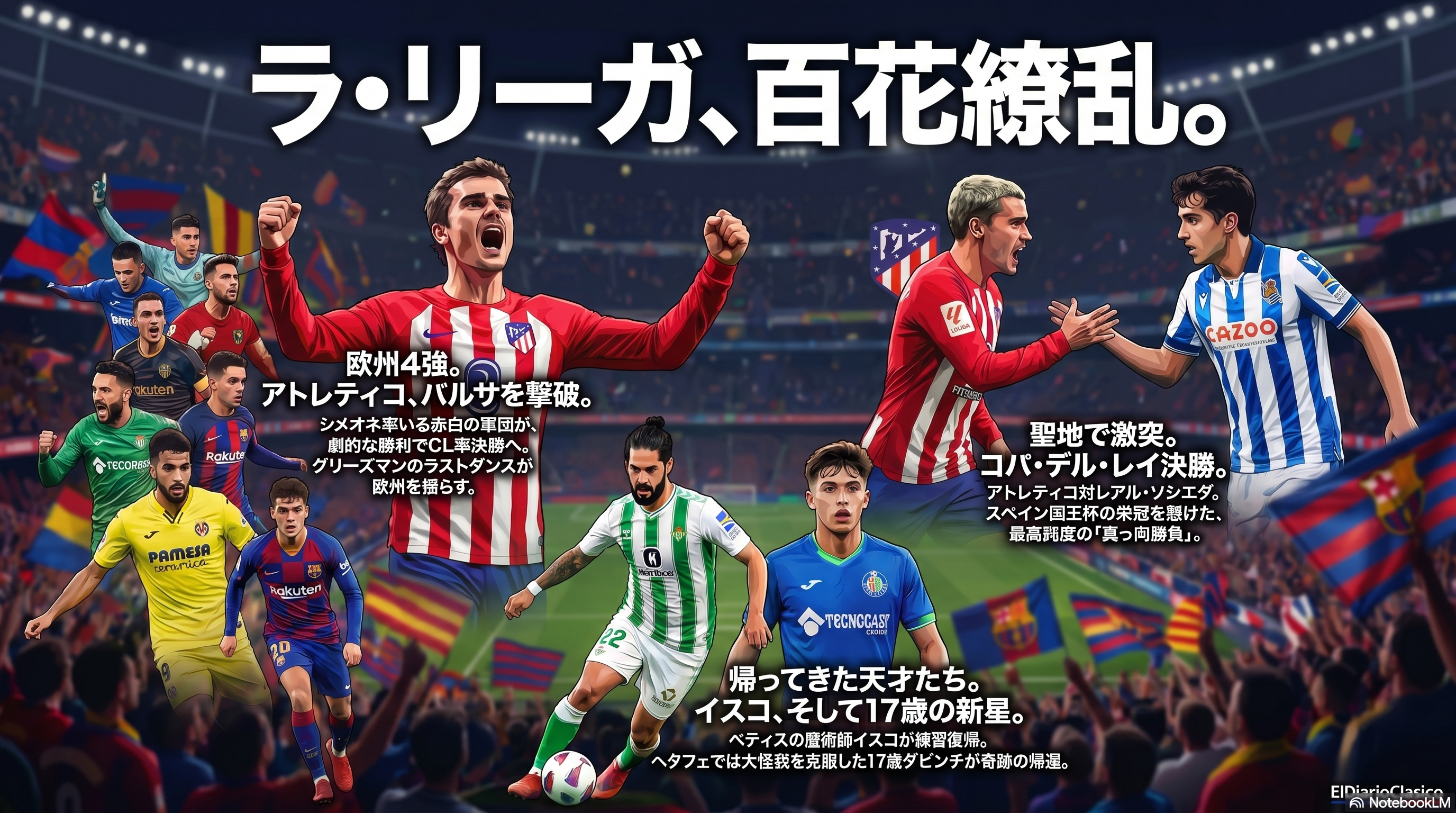 CL・ELといった欧州の舞台でのスペイン勢の躍進や苦闘が国内リーグの様々な力学に影響を与えています。アトレティコ・マドリードのCL準決勝進出は、ビジャレアルへの予期せぬボーナス収入や、バレンシアの残留争いに有利なターンオーバーの可能性を生み出すなど、各クラブの明暗を分ける波及効果をもたらしています。また、マジョルカの浅野拓磨をはじめ、負傷者の復帰が終盤戦の鍵を握るチームが多く、監督人事(ビルバオのテルジッチ氏合意など)や契約延長の話題も本格化。1部昇格・残留に向けた下位カテゴリーの熾烈な争いと合わせ、ラ・リーガ全体がシーズンのクライマックスに向けて最高潮の熱気に包まれています。