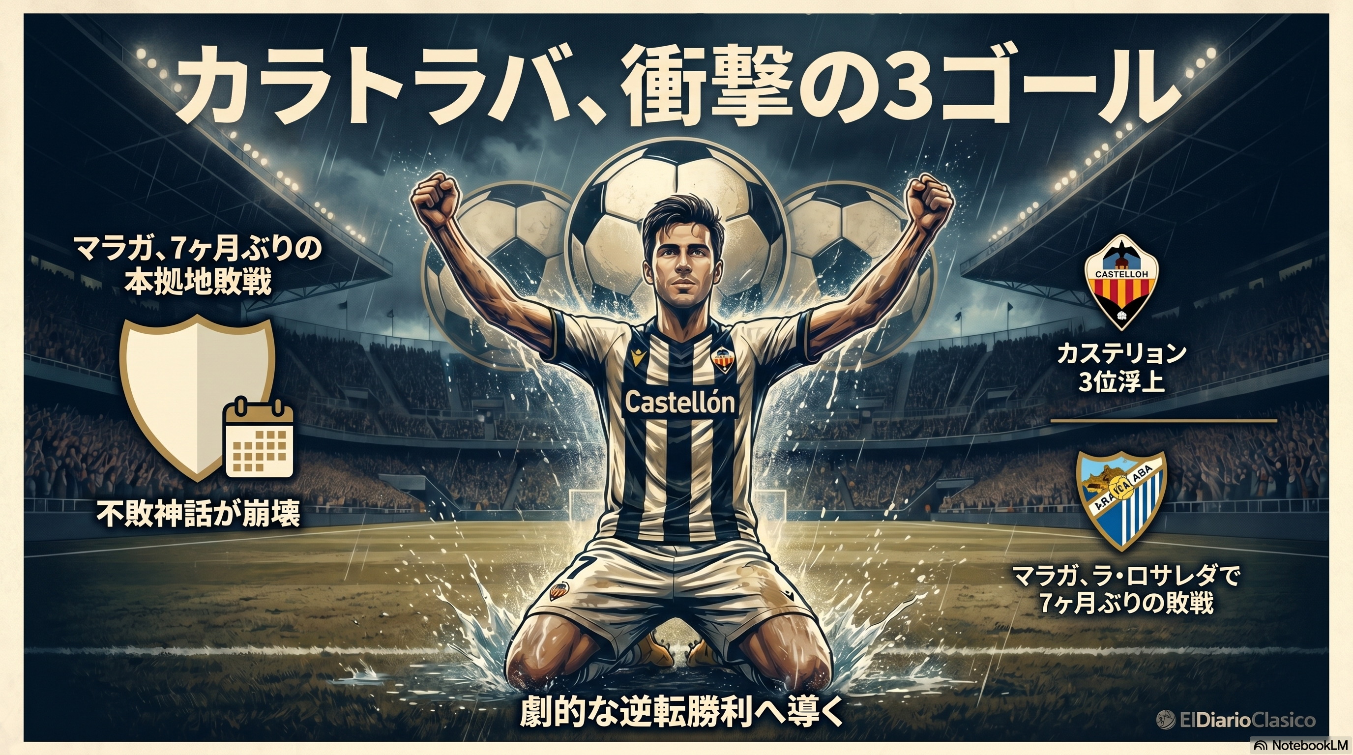 ラ・リーガ・ハイパーモーション第37節、敵地ラ・ロサレダに乗り込んだCDカステリョンは、マラガCFを相手に3-2の劇的な逆転勝利を収めた。この試合の絶対的な主役となったのはアレックス・カラトラバ(カラ)で、見事なハットトリックを達成してチームの攻撃を牽引し、マラガに手痛い一撃を与えた。試合後、パブロ・エルナンデス監督は「この勝利は精神的に非常に大きな意味を持つ」と語り、チームの士気と今後の昇格争いに直結する極めて重要な勝ち点3であることを強調している (via SPORT) (via AS) (via Mundo Deportivo) (via MARCA)。