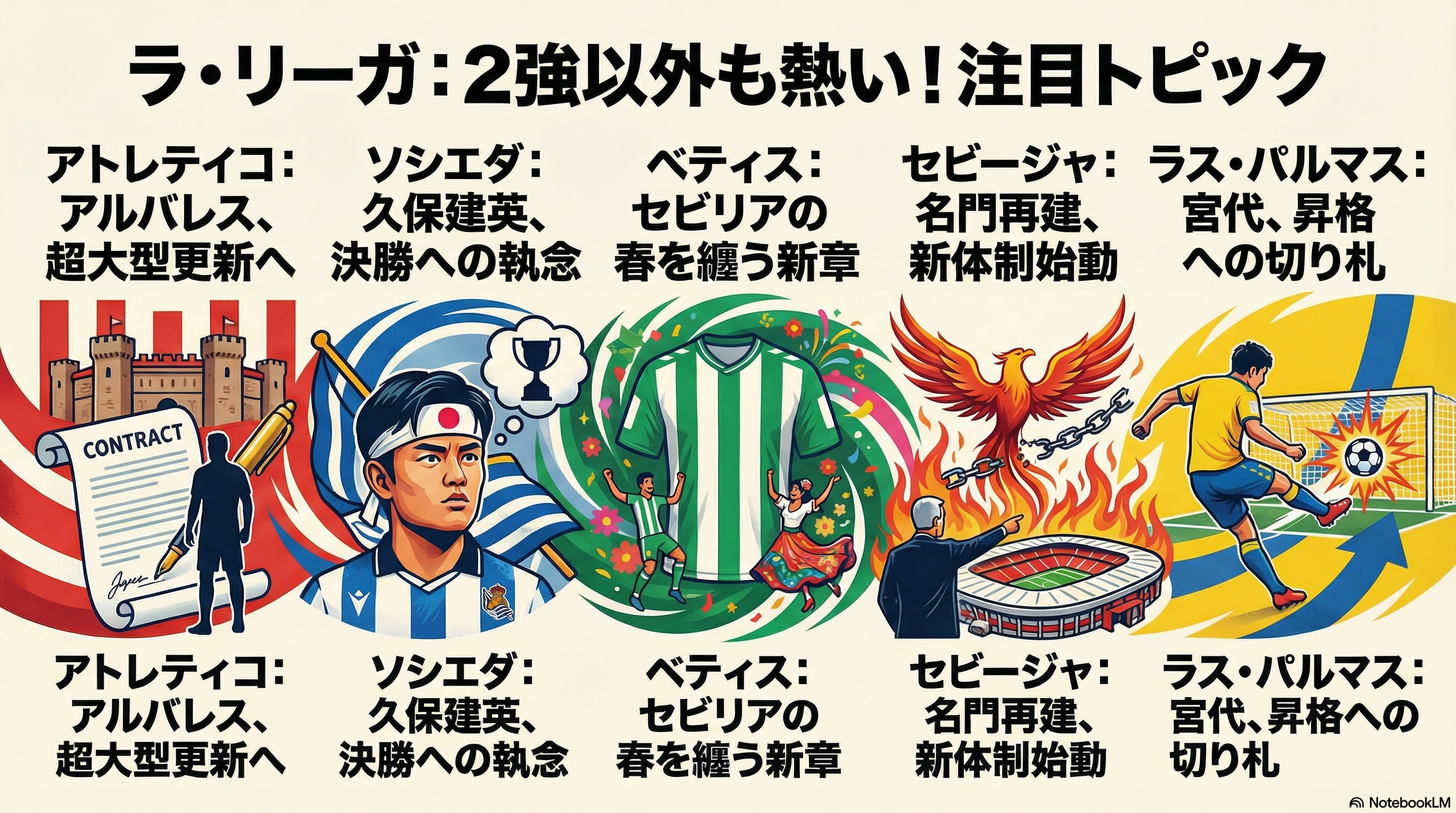本日のラ・リーガ各クラブの動向は、代表ウィーク中でありながらも非常に熱を帯びたトピックが目白押しでした。久保建英選手がコパ・デル・レイ決勝への強い思いを語り、宮代大聖選手がプレーオフに向けてチーム内で絶賛されるなど、日本人選手の活躍とポジティブな状況が際立っています。また、アトレティコのバルベルデ処分に対する怒りの抗議や、コルドバの監督解任危機、セルタのチケット転売問題など、ピッチ外での論争やクラブ特有の課題も浮き彫りになりました。各チームがシーズン終盤に向けた残留争い、昇格プレーオフ、そして欧州カップ戦権獲得へ向けて、契約延長や負傷者の復帰などあらゆる手を尽くして総力戦の構えを見せています。代表戦が明けた後のリーグ戦再開に向け、各クラブのテンションは最高潮に達しています。