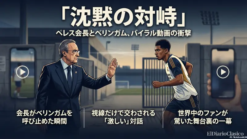 レアル・マドリードの周辺で、ちょっとした出来事が話題を呼んでいる。フロレンティーノ・ペレス会長がジュード・ベリンガムを呼び止める場面がカメラに捉えられた。二人の間には言葉を交わさずとも激しいやり取りがあり、その反応の様子が瞬時にインターネット上でバイラル化した。