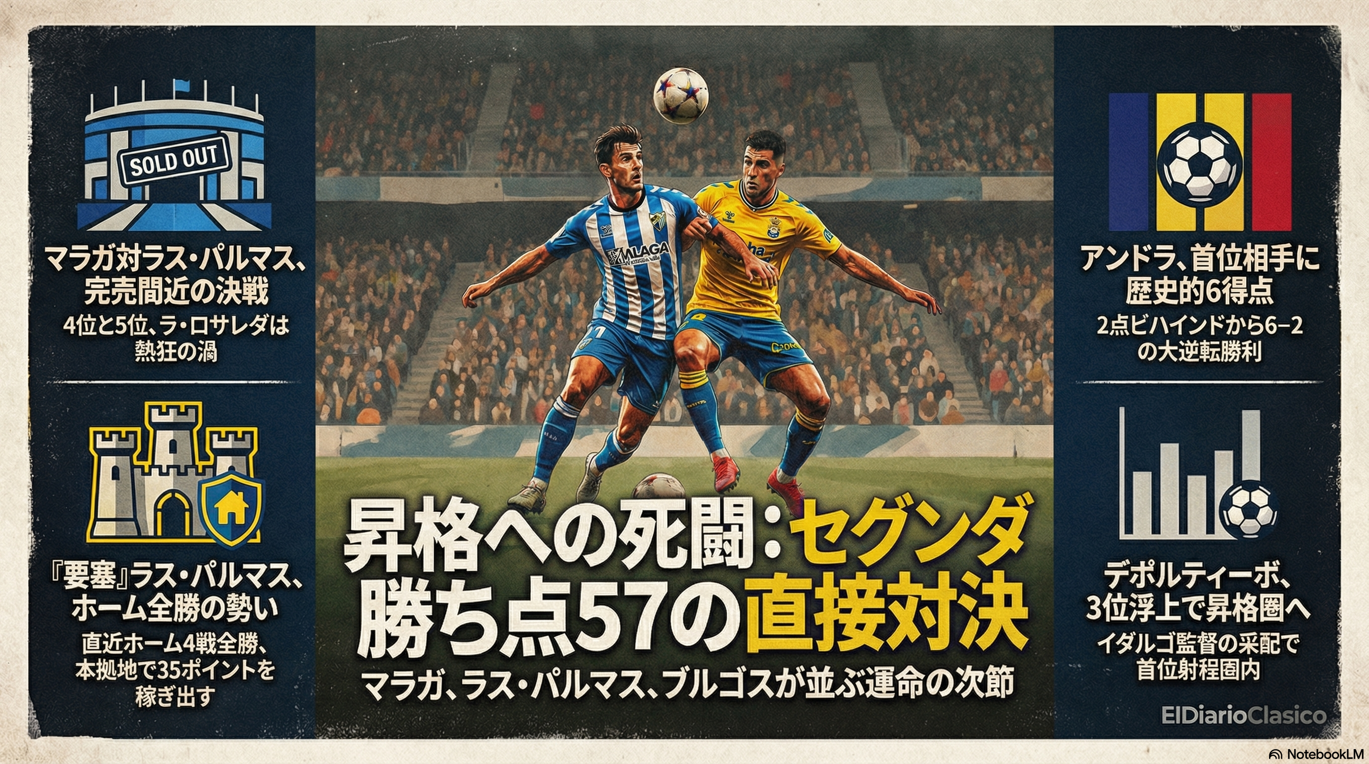 LALIGA Hypermotionはシーズン最終盤を迎え、かつてないほどの大混戦となっている。首位レーシングがアンドラに歴史的大敗を喫したことで波乱が起き、デポルティボやアルメリアが上位に肉薄している。また、勝ち点57にマラガ、ラス・パルマス、ブルゴスがひしめき、カステリョンも勝利すればそこに並ぶという、息を呑むようなプレーオフ&自動昇格争いが繰り広げられている。下位では、コルドバが劇的勝利で残留へ大きく前進した一方で、サラゴサやレガネスは土壇場での失点や決定力不足により降格の危機から抜け出せずにいる。各チームにとって、1つの勝利、1つのゴールが来季の運命を左右する極限の戦いが今後も続いていく。