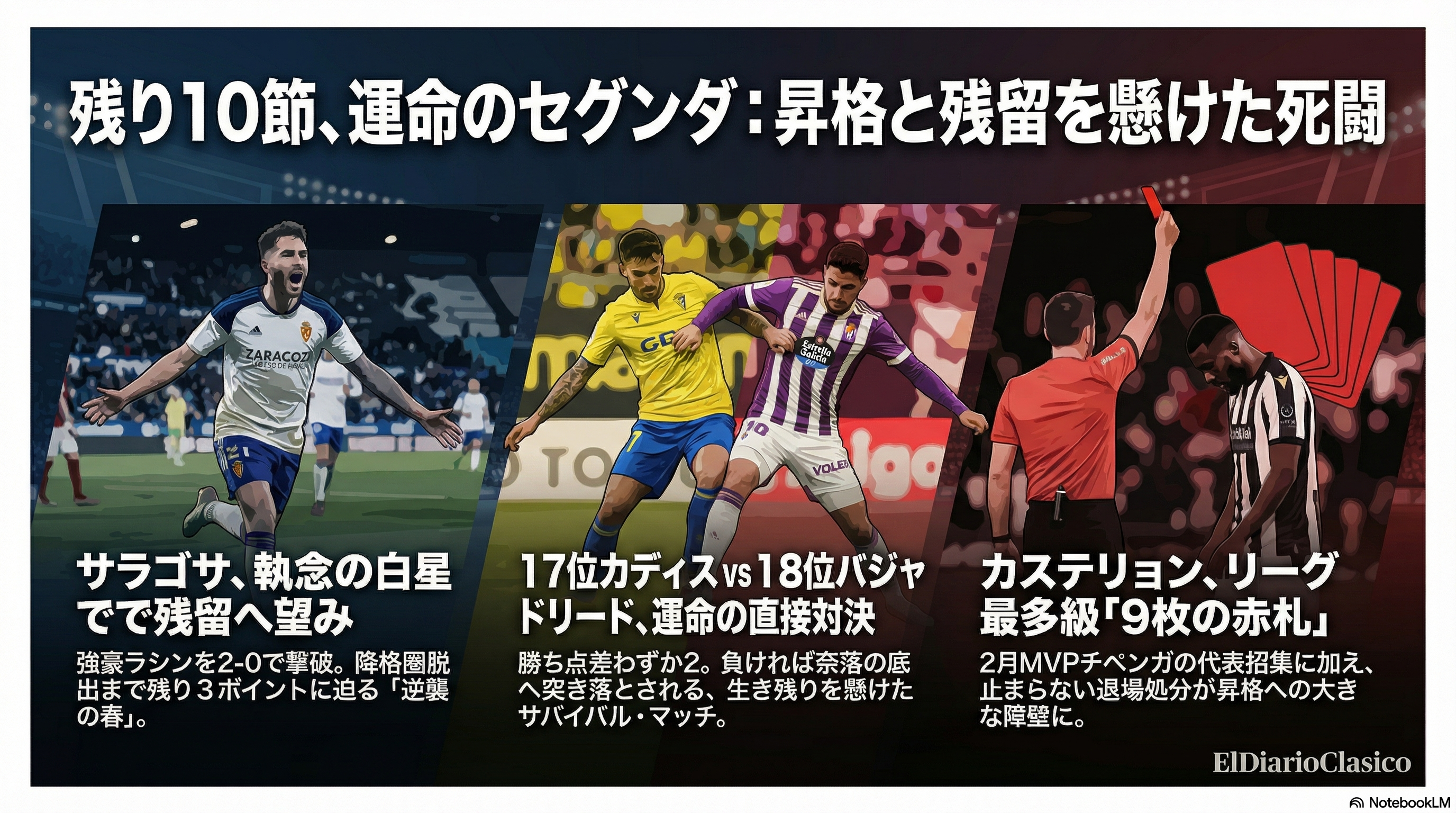 セグンダ・ディビシオンは残り10節を切り、昇格・降格争いが一層の激しさを増している。自動昇格を狙うデポルティーボ・ラ・コルーニャは主力の復帰で必勝態勢を整え、バジャドリードは土壇場での敗戦から立ち直り、昇格への望みを繋ごうと必死だ。一方で、残留圏を目指すレアル・サラゴサの奇跡的な復活劇や、度重なるトラブルと怪我人に苦しむコルドバCFの過酷なアウェイ戦など、下位のサバイバルレースも極限状態にある。カステリョンのような好調チームでさえ退場者の続出という予期せぬ落とし穴に直面しており、終盤戦に向けて各クラブの総力とメンタルコントロールが最終的な勢力図を大きく左右することになる。