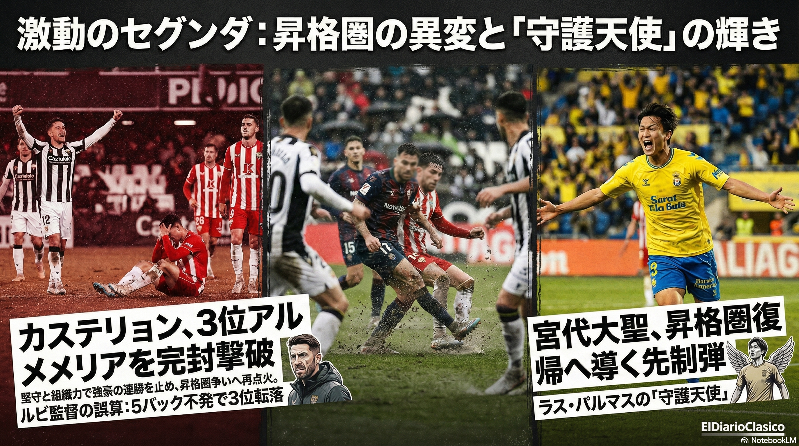 LALIGA Hypermotionは終盤戦に突入し、上位から下位まで激しい順位変動が起きています。ラシン・サンタンデールやエイバルが連勝で昇格に向けて大きく前進する一方、アルメリアやスポルティング・ヒホンは手痛い敗戦で足踏み状態となりました。残留争いでは、レガネスやサラゴサが勝ち点を分け合い、コルドバとカディスの直接対決に歴史的因縁が絡むなど、一瞬のミスや采配が命取りとなる過酷な状況が続いています。Taisei MiyashiroやChupe、Arévalo、Chukiなど若手の台頭も著しく、最後まで目が離せない展開となっています。