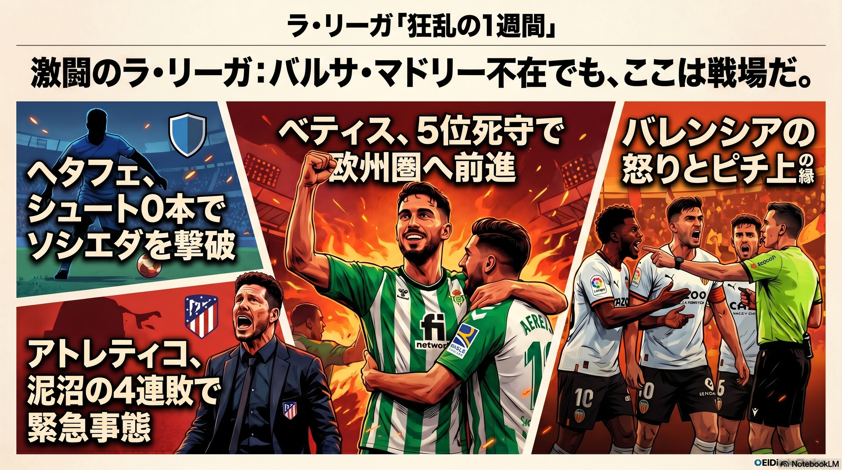 ヘタフェのボルダラス監督が、ソシエダ戦での勝利にもかかわらず「我々は適切に扱われていない」と不満を表明した点は注目に値します。これは単なる判定への不満に留まらず、クラブ全体がリーグ内で正当な評価を受けていないという感覚の表れかもしれません。一方、ソシエダではコパ・デル・レイの疲労に加え、選手への誹謗中傷や、相手選手からの妻への侮辱といったピッチ外のトラブルが重なり、チームの士気に影響を与えかねない状況です。こうした感情的な火種が、今後の試合にどう響くか注視が必要です。