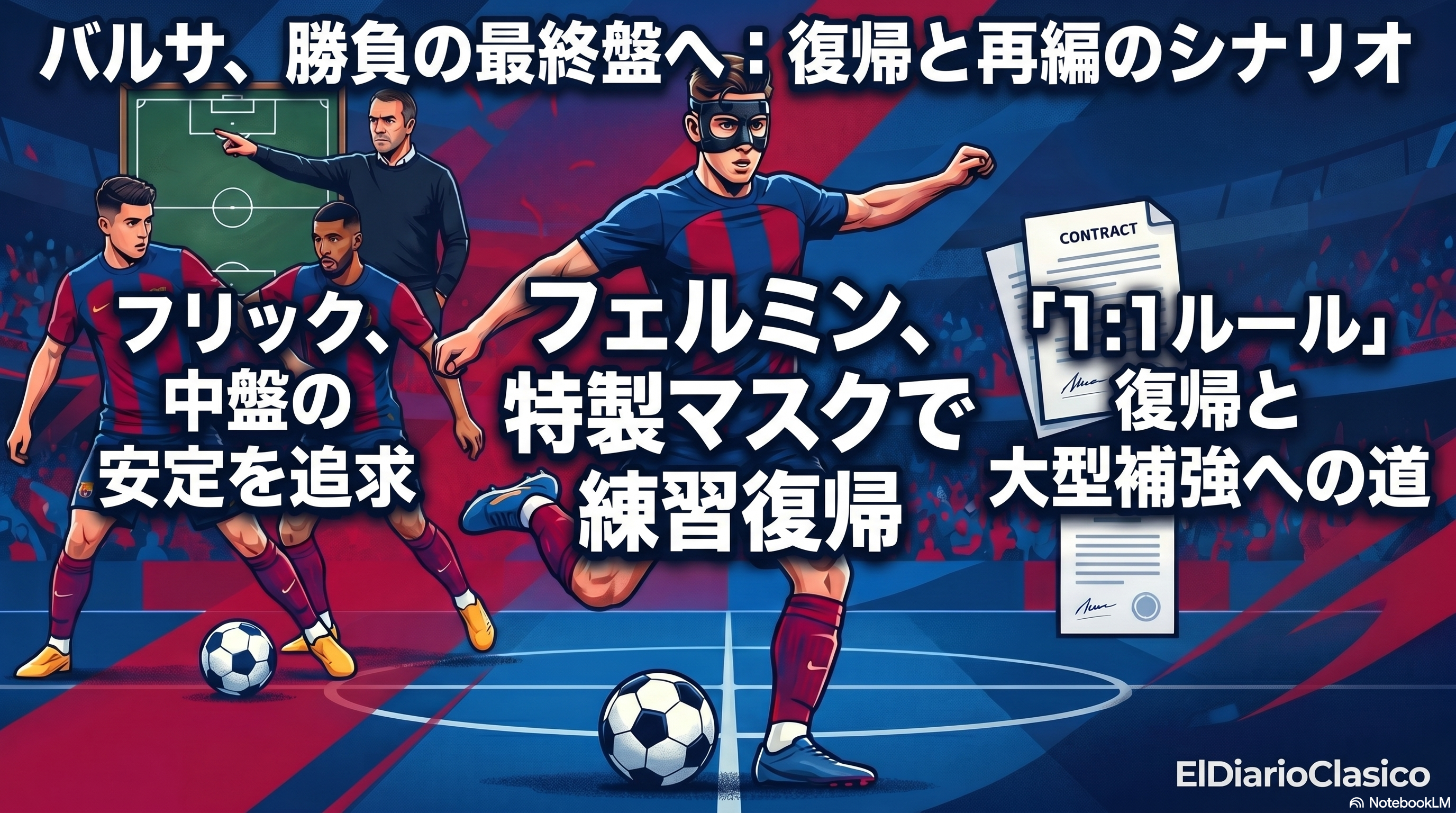 フェルミンが特製マスクで練習に復帰する中、チームは水曜日のセルタ戦に向けて準備を進めています。一方で、来季に向けた給与総額の増加と補強計画、レヴァンドフスキやカンセロの去就、さらにコンセイソンやデンベレといった若き逸材の獲得動向など、ピッチ外でも重要な動きが加速しています。バルサ・アトレティコはプレーオフ自力進出の可能性が消滅し、パシフィコの負傷という痛手を負いましたが、フベニルAは首位をキープし明るい話題を提供しています。
