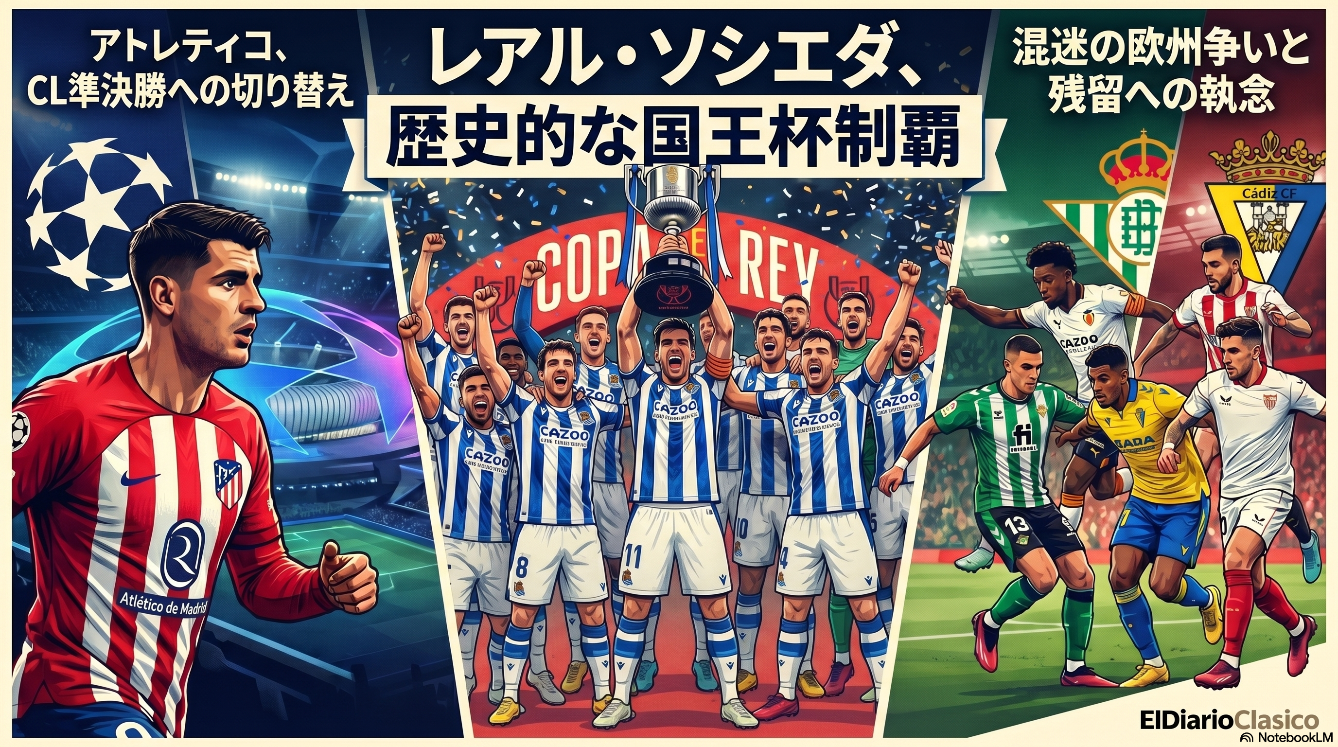 ラ・リーガは終盤戦に差し掛かり、各チームの悲喜こもごもが交差しています。レアル・ソシエダがコパ・デル・レイを制して歓喜に沸き、久保建英らのスター選手を引き留める強力な資金力を確保した一方で、敗れたアトレティコ・マドリードは主力の負傷という大きな代償を払いました。降格圏ではカディスが歴史的な不振で監督解任の危機に瀕し、マジョルカは監督交代を機に連勝街道に乗るなど、明暗がくっきりと分かれています。また、エスパニョールに対するスタジアム部分閉鎖処分など、ピッチ外の規律問題もリーグ全体に波紋を広げています。欧州カップ戦の出場権争いから残留争いまで、残り数節の戦いから目が離せません。