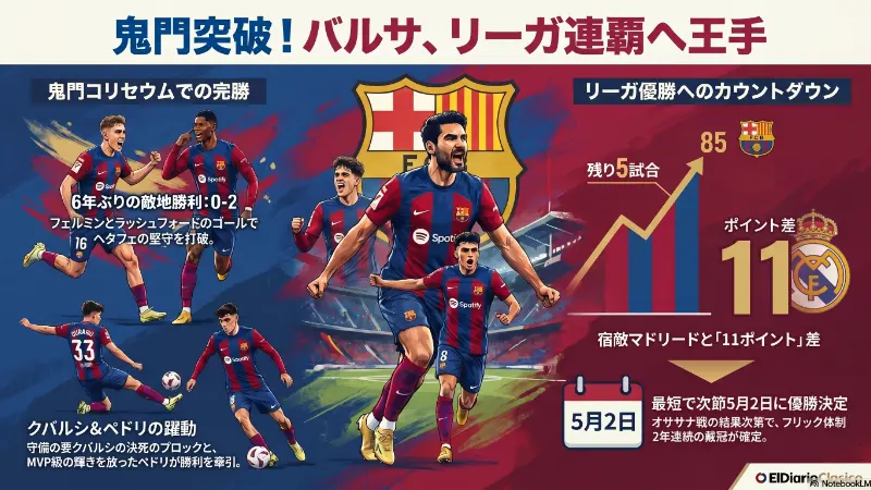 レアル・マドリードがラ・カルトゥハでつまずいたことを最大限に利用し、バルサは勝ち点を85に伸ばした。マドリードは74ポイントにとどまっており、残り15ポイント(5試合)の段階でその差は11ポイントに広がった。これにより、リーガ優勝は数日の問題となっている。最短の優勝シナリオは、5月2日土曜日にパンプローナで行われるオサスナ戦でバルサが勝利し、翌3日日曜日にコルネジャ=エル・プラットでレアル・マドリードがエスパニョールに勝てなかった場合(引き分けか負け)、数学的にバルサの優勝が決定する。あるいは、5月10日にスポティファイ・カンプ・ノウで行われるレアル・マドリードとの直接対決、エル・クラシコで勝利すれば自力での優勝が決まる。メディアや識者の間でも歓喜の声が上がっており、ホタ・ジョルディは『バルサが土曜日にパンプローナで勝ち、日曜日にエスパニョール(マノロ・ゴンサレス監督)がコルネジャでマドリードを相手に…私たちにリーガを与えてくれるかもしれない。これは詩ではないか?クレの心配事は、どこでいつリーガを祝うかを考えることだ。このチームは最高だ。今日、フリックは自分がチャンピオンだと分かっている』と興奮気味に語り、ルイス・フラケールも『ラミンのいない生活も、目まぐるしいペースで首位を走る1部のリーダーには微笑み続けている。リーガはもうすぐそこだ』とチームの充実ぶりを表現した。