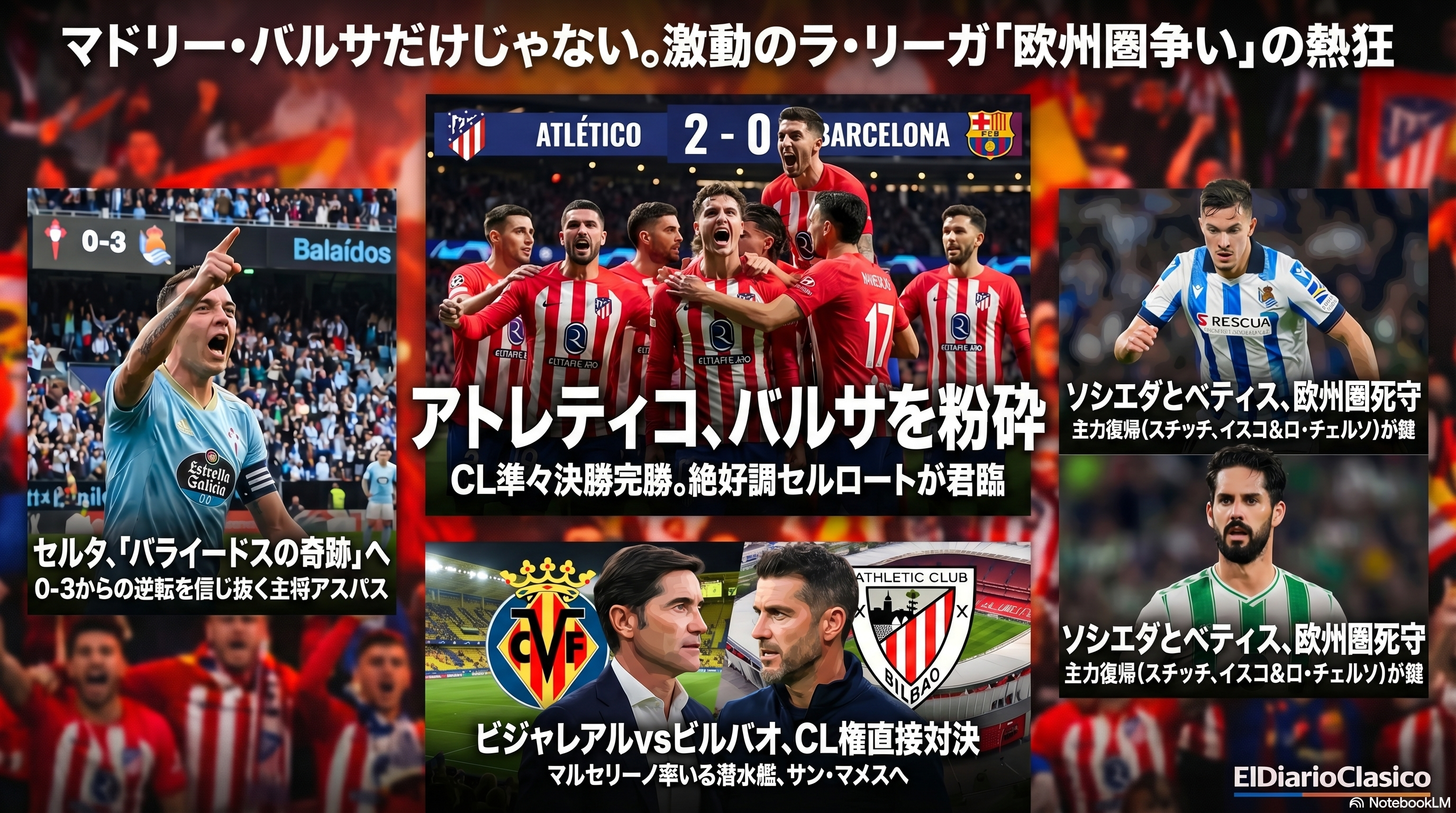 CL準々決勝第1戦、アウェイでFCバルセロナに0-2の完勝を収めた。フリアン・アルバレスが直接FKで先制し、アレクサンデル・セルロートがダメ押しの追加点を奪取。セルロートは今季CLで12試合6ゴール、リーグ戦で29試合10ゴールと絶好調であり、バルサ戦では通算8試合で5ゴール3アシストと完璧な「天敵」となっている。シメオネ監督は、クバルシ退場後に主導権を握ったチームの冷静な試合運びを評価した。次節のリーグ戦はアウェイでのセビージャ戦であり、シメオネ監督はメンドーサや復帰見込みのオブラクなどを起用する大幅なターンオーバーを予定している。一方でハンツコ、ヒメネス、バリオス、カルドーソは負傷欠場、ニコ・ゴンサレスは出場停止となる。また、来季の補強としてバルサの18歳MFマルク・ベルナルをリストアップしており、カルロス・ブセロSDらがバルサ側と接触を図っていることが判明している。(via SPORT) (via AS) (via Mundo Deportivo)