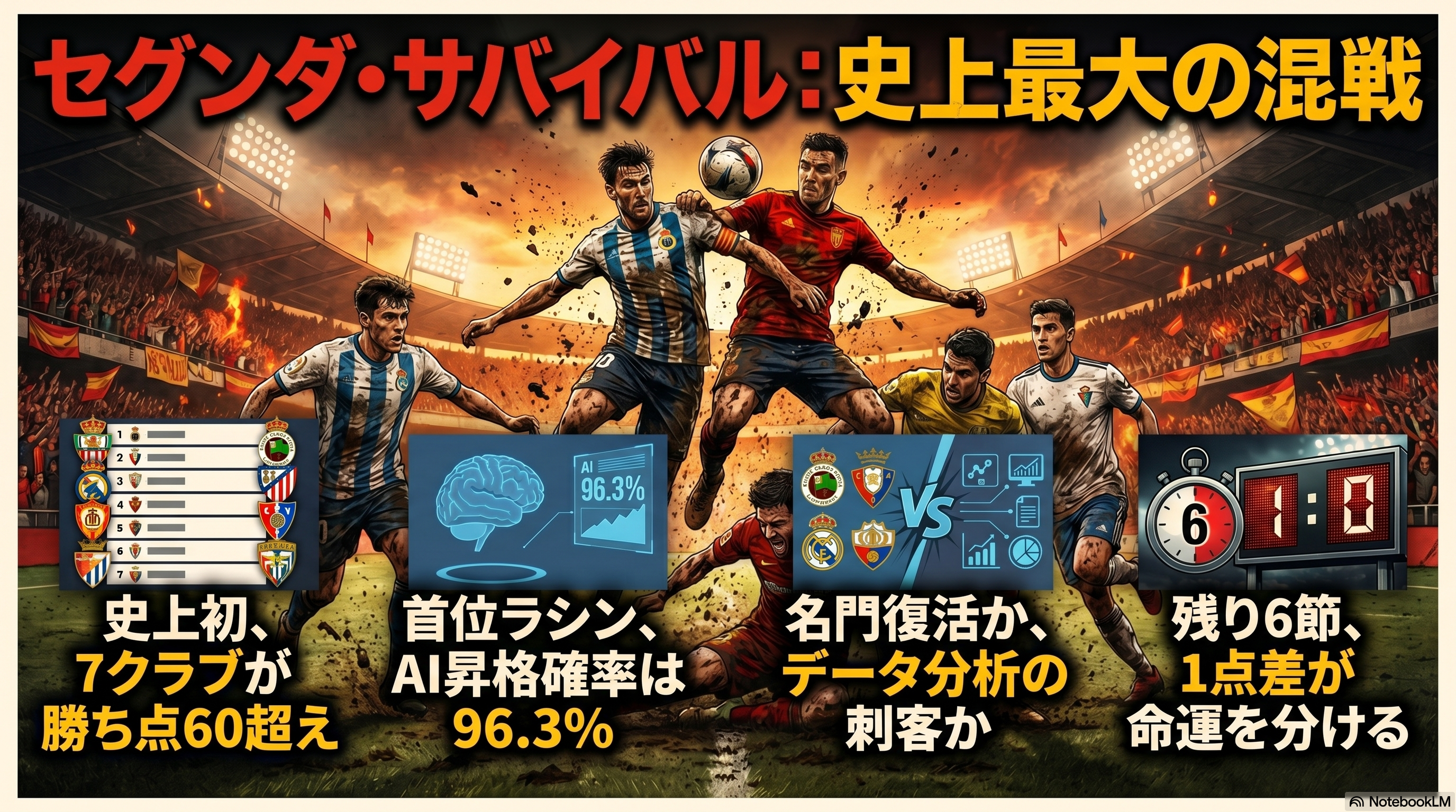 今季のスペイン2部リーグは、欧州の他の2部リーグと比較しても類を見ないほどの大混戦となっている。第36節を終えた現在、実に7チームが勝ち点60以上に到達するという、2010-2011シーズンの現行プレーオフシステム導入以来、歴史上初の異常事態が発生している。現在、1位のラシン・サンタンデール(68ポイント)を筆頭に、2位デポルティーボ(64ポイント)、3位アルメリア(64ポイント)、4位カステリョン(61ポイント)、5位ブルゴス(60ポイント)、6位ラス・パルマス(60ポイント)、7位マラガ(60ポイント)がひしめき合っている。過去の類似シーズンである2011-2012シーズン(1位デポルティーボ75ポイント、5位アルコルコン60ポイントなど)や2014-2015シーズン(1位ベティス72ポイント、5位バジャドリード62ポイントなど)でも、同時期に60ポイントを超えたのは5チームにとどまっていた。今季の激しさは過去最高レベルであり、自動昇格枠の2位デポルティーボから7位ラス・パルマスまでの勝ち点差はわずか4ポイントしかない。「自殺的」とも呼ばれる過酷な4試合の昇格プレーオフを回避するため、各クラブが残りの試合を「全て決勝戦」と位置づけ、息詰まる死闘を繰り広げている。(via MARCA)