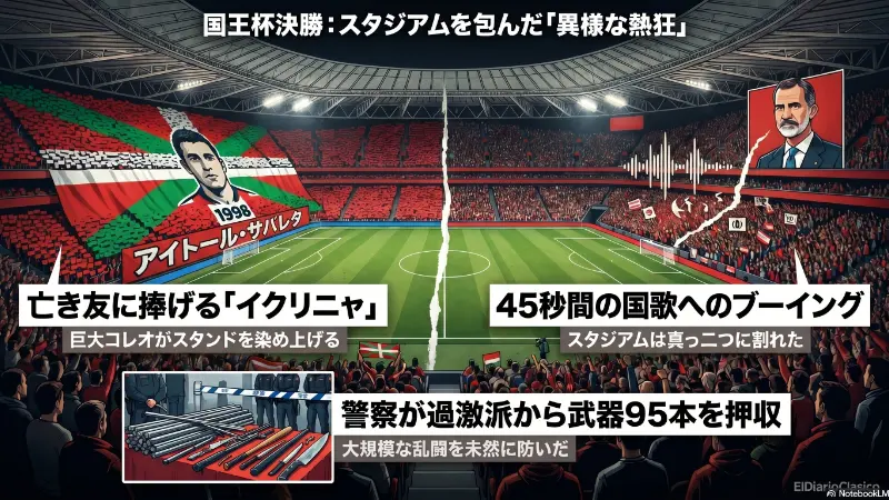 国王杯決勝という大舞台で、スペイン国歌へのブーイングという衝撃的な出来事が起きたことは、クラブを取り巻く社会的な空気の反映と言えます。政治的なメッセージがサポーターの行動に影響を与え、それがスタジアムの雰囲気を二極化させた背景には、単なるスポーツイベントでは済まされない複雑な社会情勢が横たわっています。一方で、アイトール・サバレタへの追悼コレオグラフィは、クラブのアイデンティティと歴史を重んじるファンの強い思いを表しており、感動を呼びました。これらの出来事は、フットボールが社会と切り離せない存在であり、その場の空気や歴史が観客の行動に大きく影響することを示唆しています。