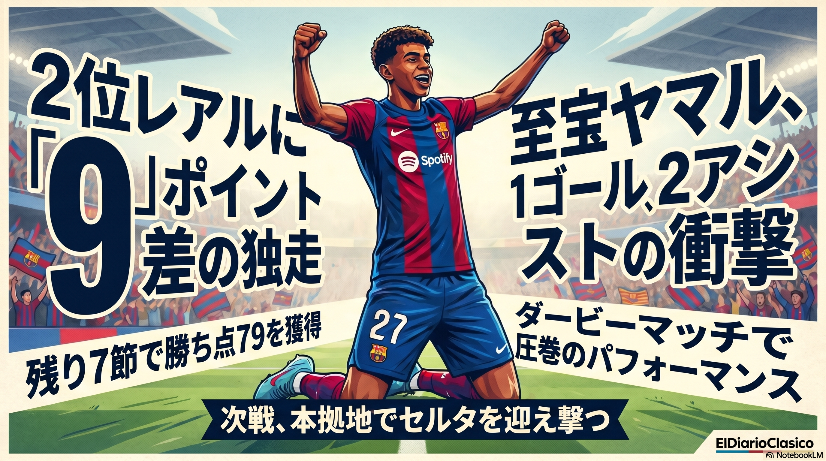 FCバルセロナは、ラ・リーガ・EAスポーツにおいて残り7節となった時点で勝ち点79を獲得し、2位のレアル・マドリード(勝ち点70)に9ポイントの差をつけて首位を独走している。今週水曜日の21時30分には、Spotifyカンプ・ノウでセルタ・デ・ビーゴを迎え撃つ。直近の第31節では、エスパニョールとのバルセロナダービーに4-1で大勝した。この試合ではフェラン・トーレスが2ゴールを記録し、ラミン・ヤマルは1ゴール2アシストの大活躍を見せた。ヤマルはLaLiga Fantasyにおいて24ポイントを獲得し、今季累計318ポイントで堂々のトップに君臨している。(via SPORT)