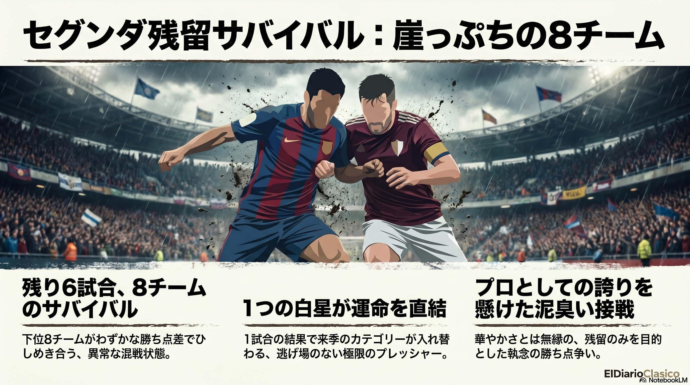 シーズン終盤を迎え、LaLiga Hypermotionの残留争いはかつてないほどの過酷さを極めている。来季もプロカテゴリーでプレーし続けるための生き残りを懸けたサバイバルレースは、現時点で明確に8つのチームによる争いに絞り込まれた。一つの勝利が希望をもたらし、一つの敗北が致命傷になり得る極限のプレッシャーの中、各クラブのプライドを懸けた泥臭い勝ち点争いが最終節まで展開される。(via MARCA)