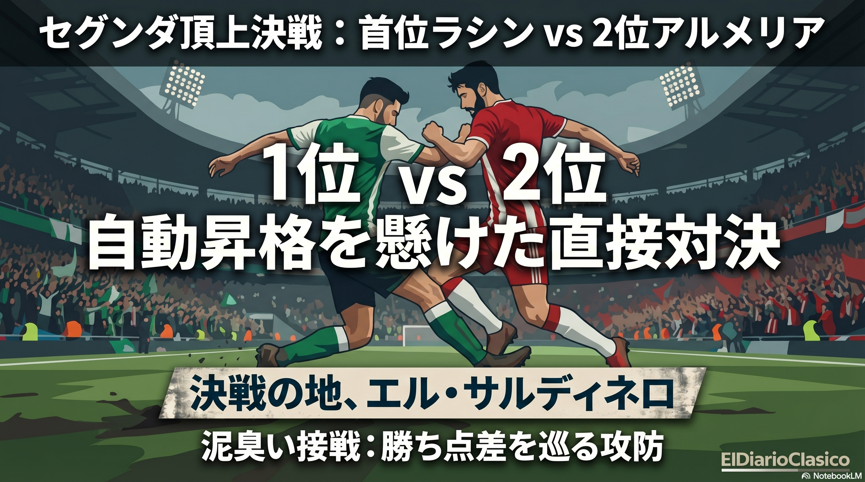 首位ラシンと2位アルメリアの直接対決は、自動昇格の行方を占う上で極めて重要です。ラシンのホームでの強さとアルメリアの反攻意欲がどう噛み合うか。特にアルメリアは前節の敗戦から立て直し、首位奪取への執念を見せるでしょう。一方、3位デポルティーボはビジャレスを中心に安定した戦いを続けており、上位2チームの動向次第では一気にトップに躍り出る可能性も秘めています。プレーオフ圏争いも混戦模様で、各チームの立ち位置や戦術的な狙いが試合の流れを大きく左右するでしょう。