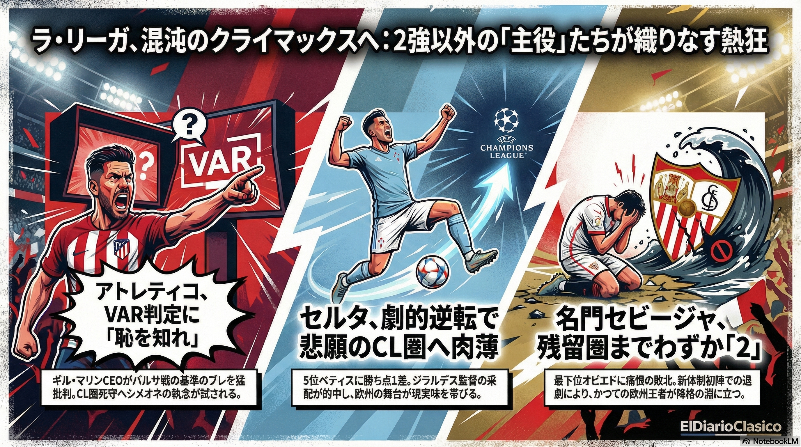 今節のラ・リーガは、上位陣の欧州カップ戦出場権争いと、下位陣の血みどろの残留争いが激しさを増している。セルタが劇的な逆転勝利で欧州圏へ急接近する一方、ヘタフェが完璧な試合運びでアスレティック・クラブをシャットアウトしダークホースとして名乗りを上げた。残留争いでは、オビエドがセビージャを下して望みを繋ぎ、マジョルカも大きな金星を挙げて降格圏を脱出。2部でもFCアンドラが首位相手に6発大勝のジャイアントキリングを起こし、アルメリアやラス・パルマスが終盤の勝負強さで昇格へ邁進している。どのカテゴリーも終盤戦に向けて全く目が離せない展開が続いている。