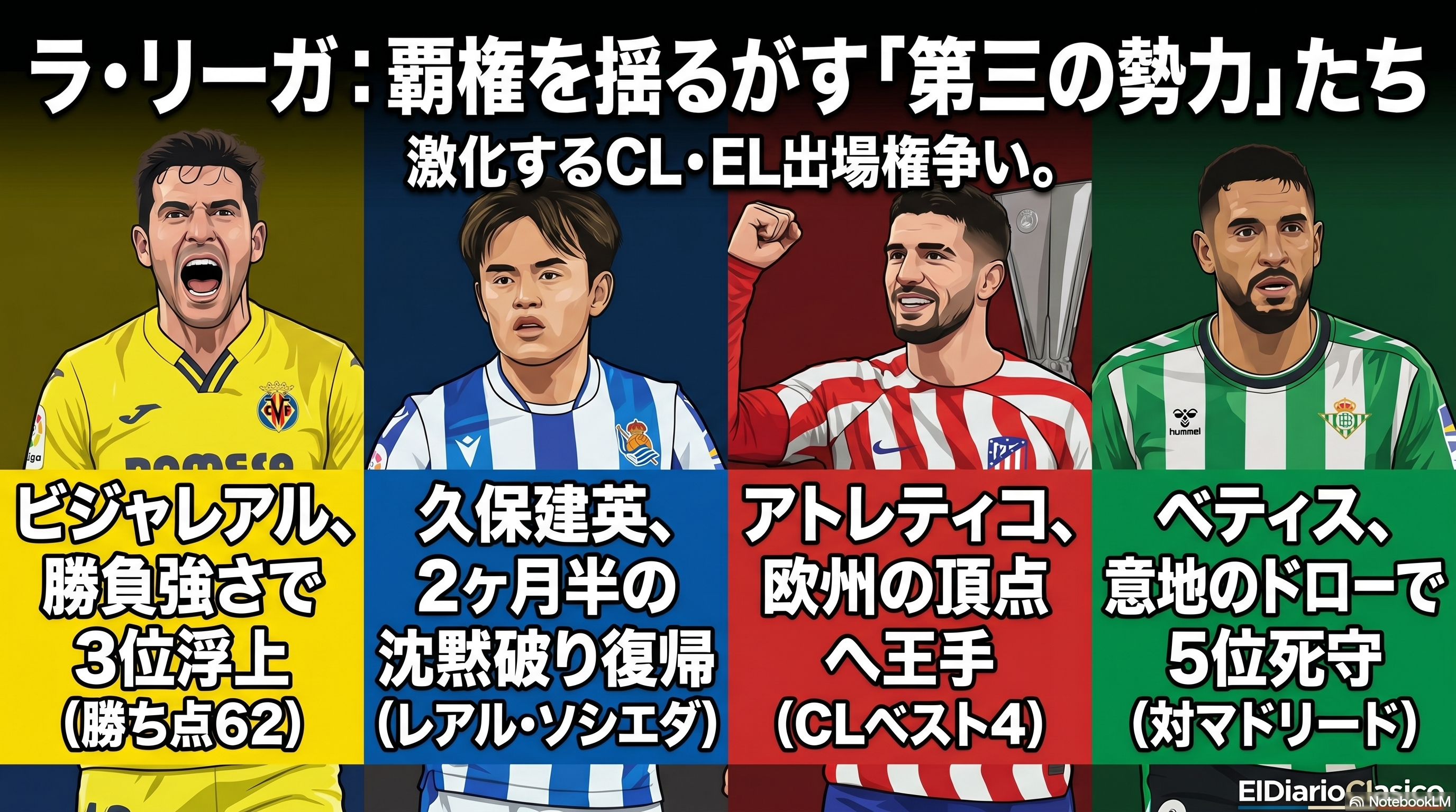 ラ・リーガ1部では、アトレティコ・マドリードがカンプ・ノウでの歴史的勝利でCLベスト4へ駒を進め、レアル・ソシエダが久保建英の復帰とともにコパ・デル・レイを制覇するなど、2強以外のクラブが欧州や国内タイトルで圧倒的な存在感を示しています。一方でベティスやエスパニョールは泥沼の不振から抜け出せず、フロントや監督への風当たりが限界に達しています。