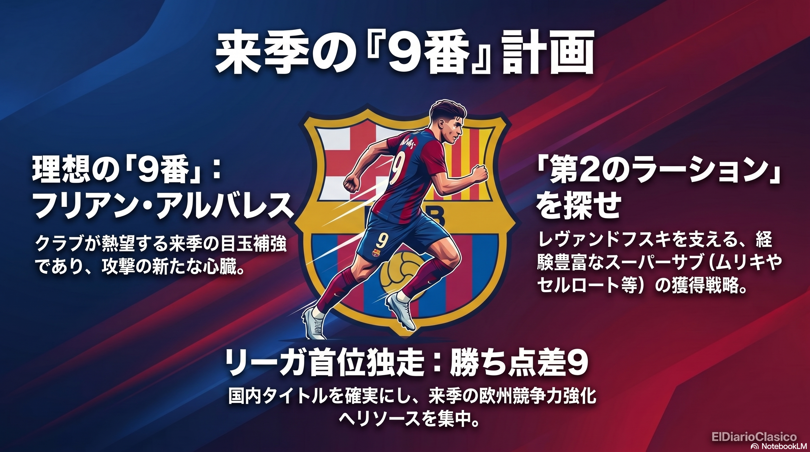🔴 クラブはすでに来季を見据えたストライカーの補強に動いている。トップチームにおいて来季も契約が残っている純粋な9番はフェラン・トーレスのみであり、ロベルト・レヴァンドフスキは37歳を迎えるためポジションの維持が危ぶまれている状態だ。カンテラにも即戦力となるストライカーが不足しており、バルサ・アトレティックは今冬にオビエドから24歳のホアキン・デルガドを獲得せざるを得なかった。クラブが求めているのは、かつて32歳でフリートランスファーで加入し、51試合で19ゴールを挙げ、2006年パリでのCL決勝で2アシストを記録したヘンリク・ラーションのようなスーパーサブとして機能するベテランFWだ。バダト・ムリキ(31歳)やアレクサンダー・セルロート(30歳)の名前が挙がっているが、年齢の割に放出交渉は容易ではない。クラブの理想的なシナリオは、フリアン・アルバレスをスタメンのスター選手として獲得し、ベテランを控えに据え、フェラン・トーレスのポリバレント性を活かすことである。過去の代役の例としては、1200万ユーロで加入し114試合19ゴールを記録したエイドゥル・グジョンセン、1800万ユーロで加入し58試合10ゴールを残したマルティン・ブライトバイテ、レンタルで29試合7ゴールを記録したルーク・デ・ヨング、そして7試合2ゴールを記録した後に600万ユーロでチェルシーへ移籍したマルク・ギウなどが比較対象として挙げられている。