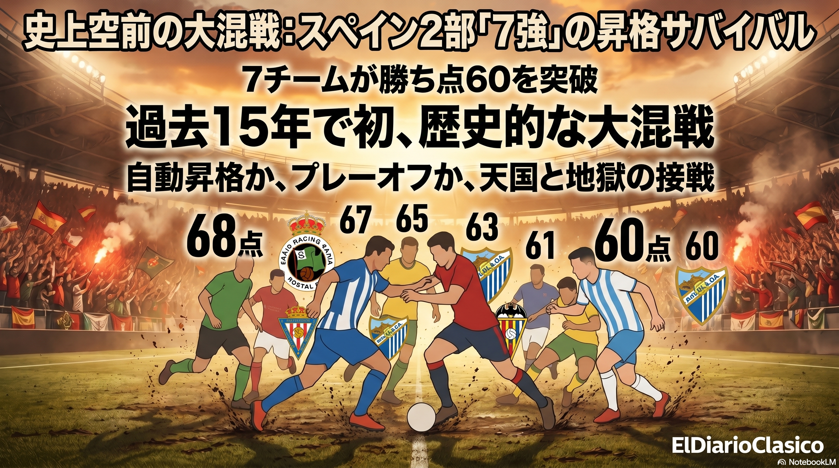 今季のスペイン2部リーグは、欧州の他の2部リーグと比較しても類を見ないほどの大混戦となっている。第36節を終えた現在、実に7チームが勝ち点60以上に到達するという、2010-2011シーズンの現行プレーオフシステム導入以来、歴史上初の異常事態が発生している。現在、1位のラシン・サンタンデール(68ポイント)を筆頭に、2位デポルティーボ(64ポイント)、3位アルメリア(64ポイント)、4位カステリョン(61ポイント)、5位ブルゴス(60ポイント)、6位ラス・パルマス(60ポイント)、7位マラガ(60ポイント)がひしめき合っている。過去の類似シーズンである2011-2012シーズン(1位デポルティーボ75ポイント、5位アルコルコン60ポイントなど)や2014-2015シーズン(1位ベティス72ポイント、5位バジャドリード62ポイントなど)でも、同時期に60ポイントを超えたのは5チームにとどまっていた。今季の激しさは過去最高レベルであり、自動昇格枠の2位デポルティーボから7位ラス・パルマスまでの勝ち点差はわずか4ポイントしかない。「自殺的」とも呼ばれる過酷な4試合の昇格プレーオフを回避するため、各クラブが残りの試合を「全て決勝戦」と位置づけ、息詰まる死闘を繰り広げている。(via MARCA)