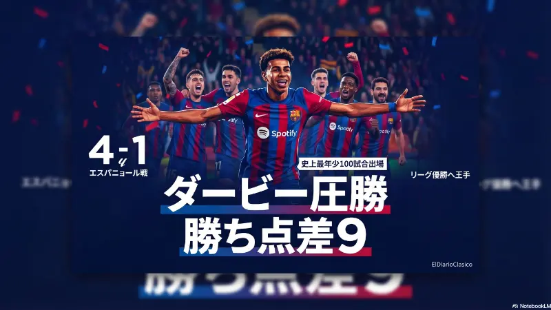 エスパニョールとのダービーに快勝しリーガ優勝に大きく前進した一方で、試合後の騒動やCLアトレティコ戦に向けた守備陣の不安など、熱気と緊張が交錯する一日となった。ラミンの大記録達成やアタッカー陣の奮起を武器に、大逆転でのCL準決勝進出を目指す!