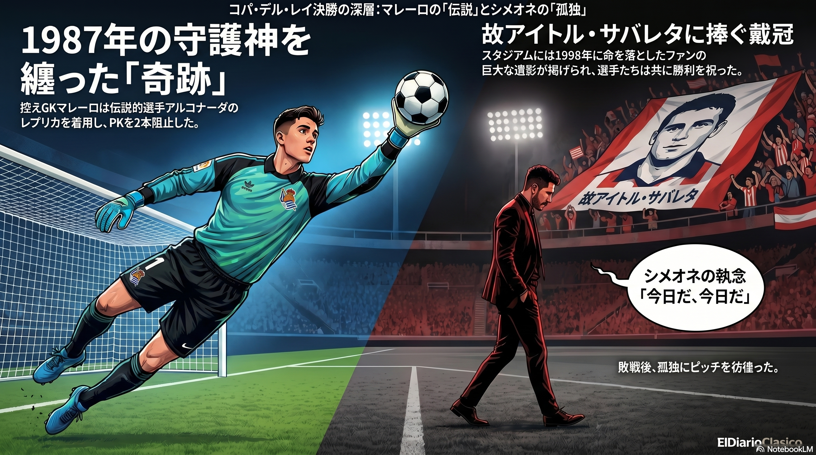 レアル・ソシエダがPK戦の末にアトレティコ・マドリードを下し、コパ・デル・レイ優勝を果たした裏側には数々のドラマがあった。控えGKのウナイ・マレーロは、1987年の優勝時にルイス・アルコナーダが着用していたレプリカユニフォームを着てPK戦に臨み、見事に2本のシュートをストップした。マレーロはアトレティコのGKフアン・ムッソとの心理戦について『彼は自分のために戦い、私は私のために戦います。ムッソをとても尊敬しています。彼は素晴らしいシーズンを送っています。皆さんご存知の通り、彼のために嬉しいです。そのまま続けてほしいです』と相手を称えた。PKストップの秘訣については『カンペがあり、最後の数本のPKは直感で止めましたが、ただ匂いを嗅いだだけです』と明かし、最後のキッカーを務めたかつてのボールボーイ、パブロ・マリンへの言葉として『落ち着いて自分を信じるように言いました。私はとても落ち着いていました』と語った。さらにキャプテンのオヤルサバルへの感謝として『ミケルは最高の奴です。彼はZubietaの若手たちをとても大切にしてくれます。彼は私たちに、信じるように、私たちがそれを達成できると言ってくれました』と述べた。