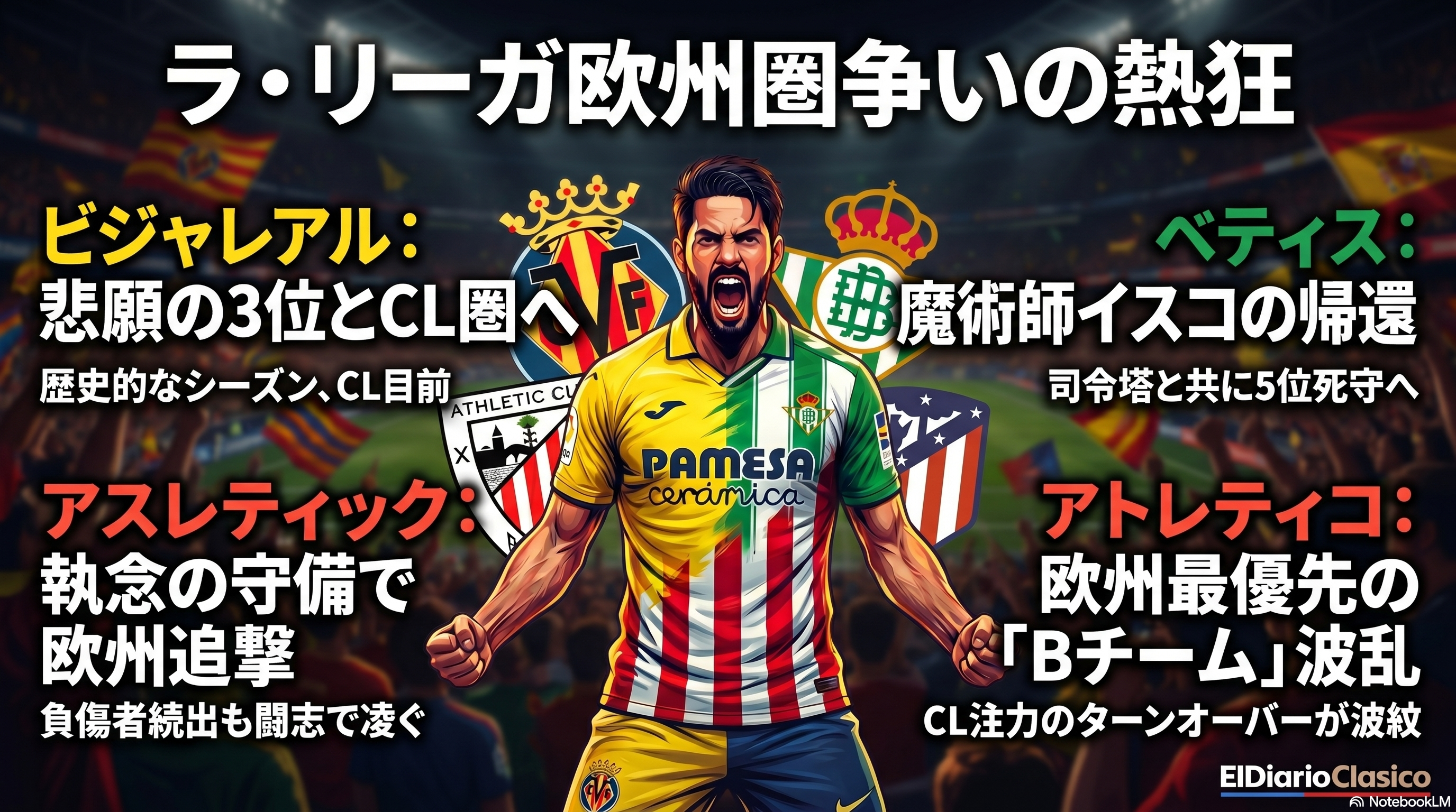 ラ・リーガ終盤戦、ヨーロッパのカップ戦出場権を巡る熾烈な争いと、すでに来季を見据えた各クラブのフロントの動きが激化しています。アスレティック・ビルバオは極限の野戦病院状態に耐えながら貴重な勝利をもぎ取り、セルタは守備の絶対的な要を欠きながら王者バルセロナの本拠地に乗り込みます。そしてレアル・ソシエダは、チームの攻撃を牽引する久保建英のイングランド移籍の可能性という巨大な不確定要素を抱えながら、4つの大会を戦い抜くための補強計画を進行中です。ピッチ上の勝ち点争いと並行して、移籍市場での水面下の駆け引きから目が離せません。