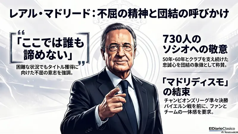 チャンピオンズリーグのバイエルン戦というシーズン最大の決戦を前に、クラブは深刻な無冠の危機と世代交代の失敗という大きな逆風に直面しています。ペレス会長はソシオ表彰式でクラブの歴史と団結を力強く訴えましたが、彼自身の経営手腕に対する厳しい批判も噴出しています。ラ・リーガの優勝は絶望的であり、カルバハルの見事な活躍やクロース復帰のニュースといった数少ない希望の光を胸に、チームはミュンヘンでの奇跡の逆転劇にすべてを懸けます。