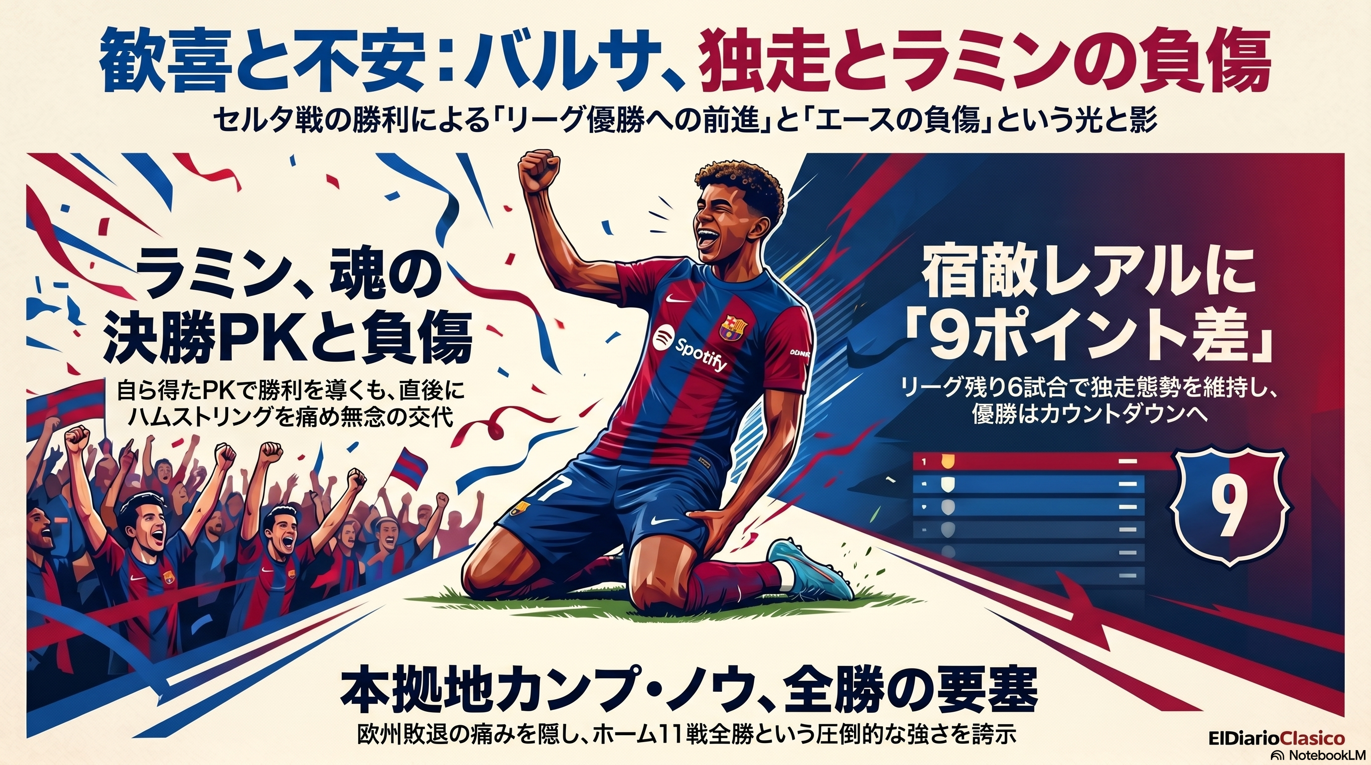 セルタに辛勝しリーグ連覇へ王手をかけたバルセロナだが、ラミン・ヤマルら主力の相次ぐ負傷という重い代償を払った。ラッシュフォードの去就問題やデ・ヨングの歴史的記録など、ピッチ内外で激動の1日となった。