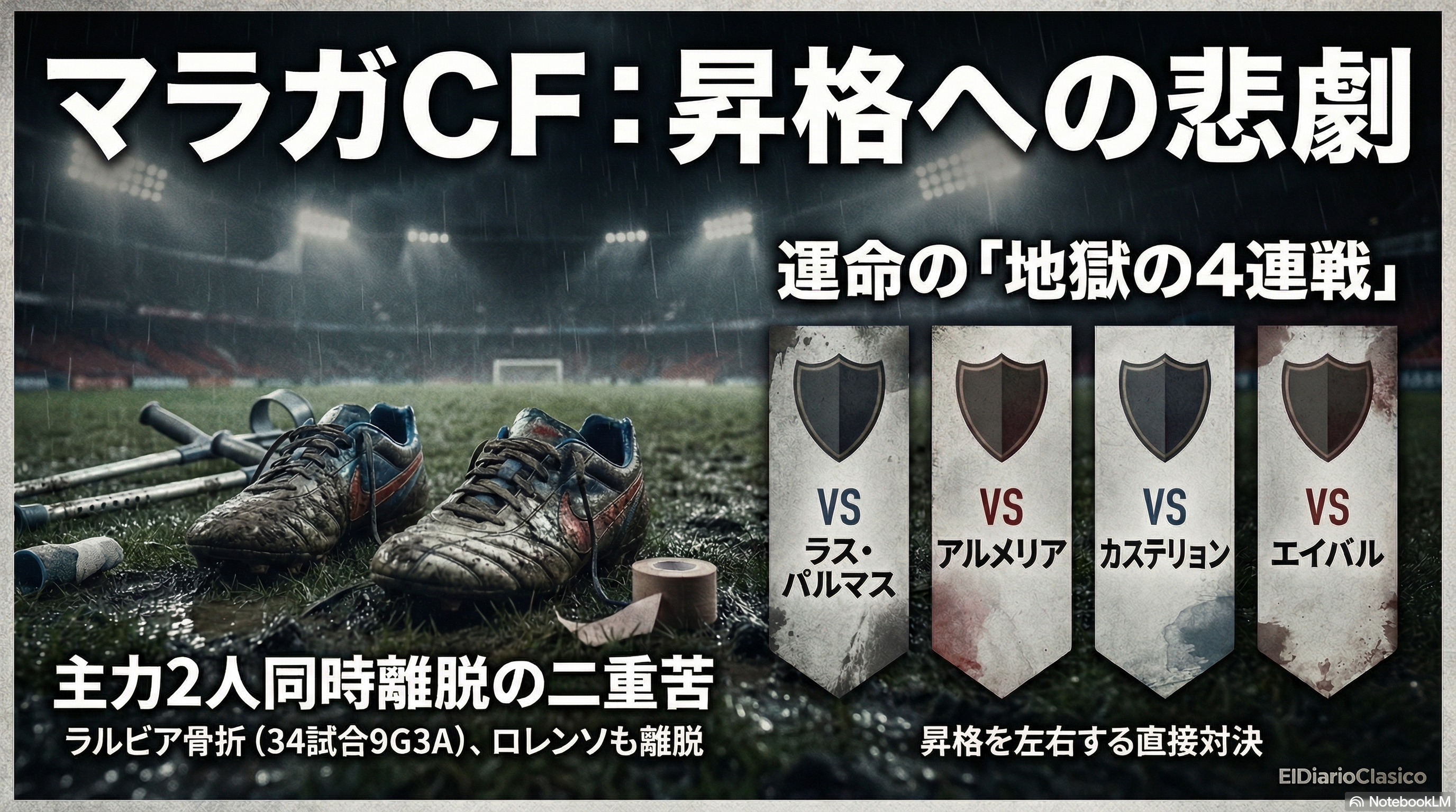 プレーオフ進出圏争いを繰り広げているマラガCFに、最悪のタイミングで激震が走っている。攻撃の要であり、今季34試合に出場(先発33試合、2877分プレー)して9ゴール3アシストと自己最高のシーズンを送っていた若き才能ダビド・ラルビアが、左足舟状骨の骨折により数週間の離脱を余儀なくされた。この負傷は3月21日のカディス戦(0-3で勝利)で負ったものであり、直近の試合では患部に痛み止めを打って強行出場していたが、スプリントやドリブルのキレが明確に落ちており限界に達した形だ。さらに、中盤の絶対的支柱であるダニ・ロレンソもヒラメ筋の負傷で数週間の離脱となっている。チームはアンドラ戦とデポルティボ戦で価値ある引き分けを演じるなど、フネス監督就任以降は高い競争力を保ち、流動的でクオリティの高いフットボールを展開してきたが、この圧倒的な存在感を示す2枚を欠く痛手は計り知れない。次節はイサン・メリーノも累積警告で出場停止となる。今後のラス・パルマス(ホーム)、アルメリア(アウェー)、カステリョン(ホーム)、そしてエイバル(アウェー)という自力での昇格を左右する上位陣との直接対決4連戦に向けて、監督は右サイドにドリオを配置するか、ホアキン・ムニョスを右に回し、左サイドにロベテやオチョアを起用するなどのスクランブル体制を強いられている。一方で、カルロス・ドトールが順調な回復を見せており、復帰が近いのは唯一の朗報だ。(via AS)(via MARCA)