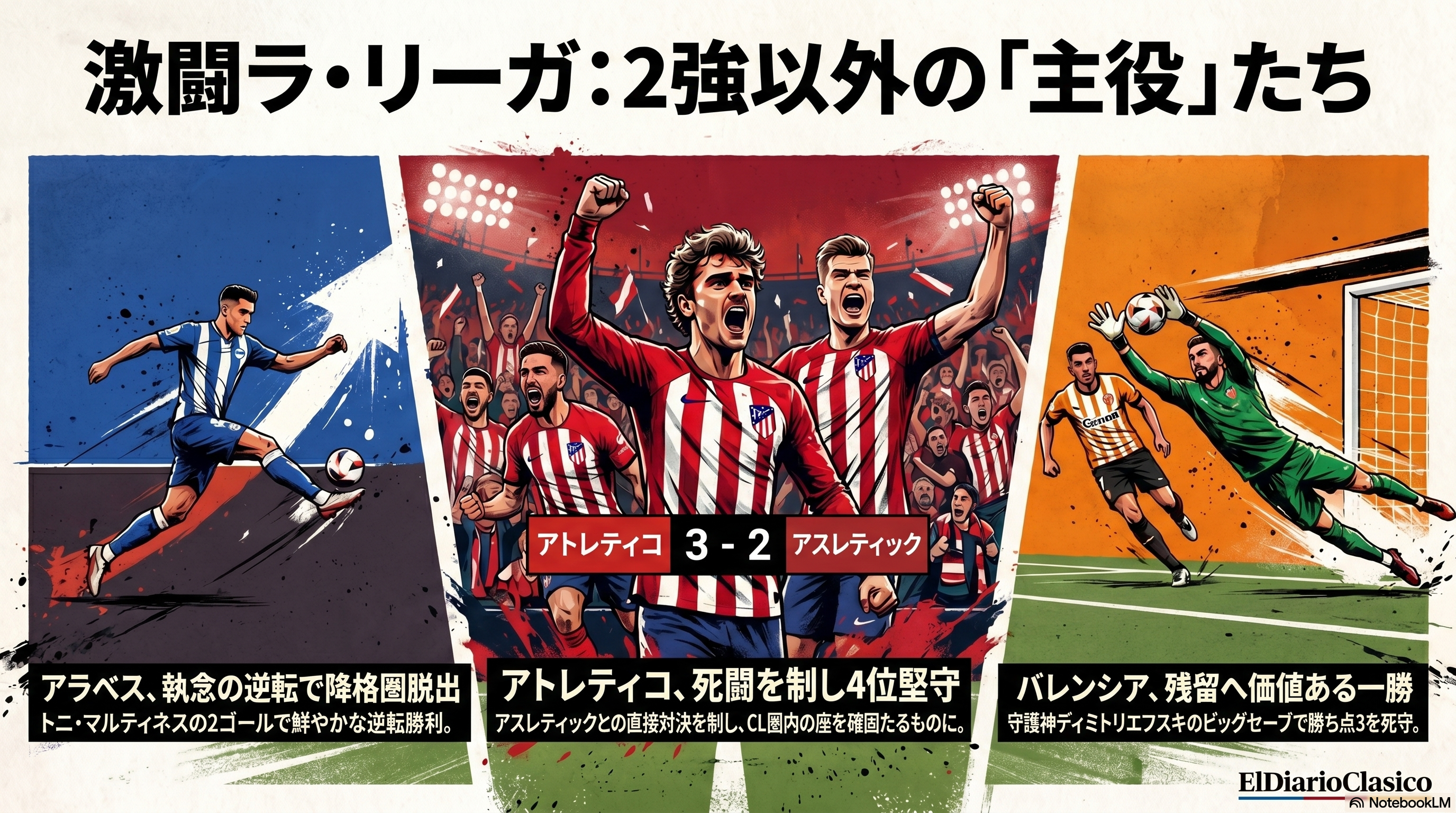 ディエゴ・シメオネ監督率いるチームは、ホームでアスレティック・クラブと対戦し3-2の勝利を収めた。アントワーヌ・グリーズマンが同点ゴールを記録し、アレクサンデル・セルロートが相手ディフェンスのミスを突いて決定的なゴールを奪うなど、攻撃陣がしっかりと結果を残した。この勝利により、来季のチャンピオンズリーグ出場圏内である4位の座を確固たるものにしている。(via AS)(via MARCA)(via Mundo Deportivo)