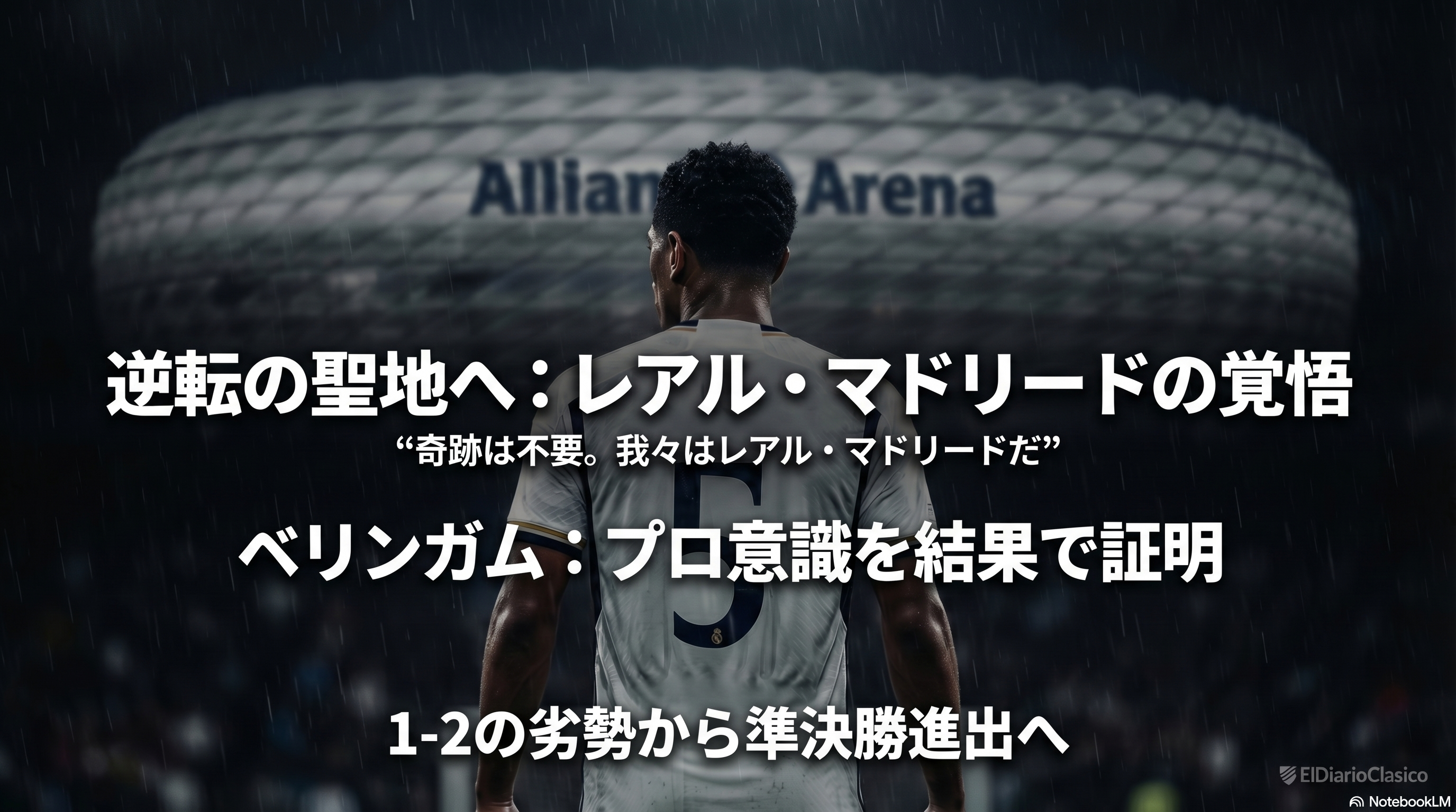 アルベロア監督の言葉からは、クラブの歴史と伝統に根差した揺るぎない自信が感じられます。逆転への強い決意表明は、選手たちの士気を高める上で不可欠な要素でしょう。一方で、ベリンガムが私生活の噂を強く否定し、プロフェッショナリズムを強調した点は、チーム内に外部からのノイズに対する警戒感があることを示唆しています。アセンシオの突然の離脱は、チームのコンディション管理や、復帰したばかりの選手への起用法といったクラブ内部の課題を浮き彫りにする可能性もあります。大一番を前に、チームとして一体感を保ち、ピッチ外の雑音を遮断できるかが重要です。