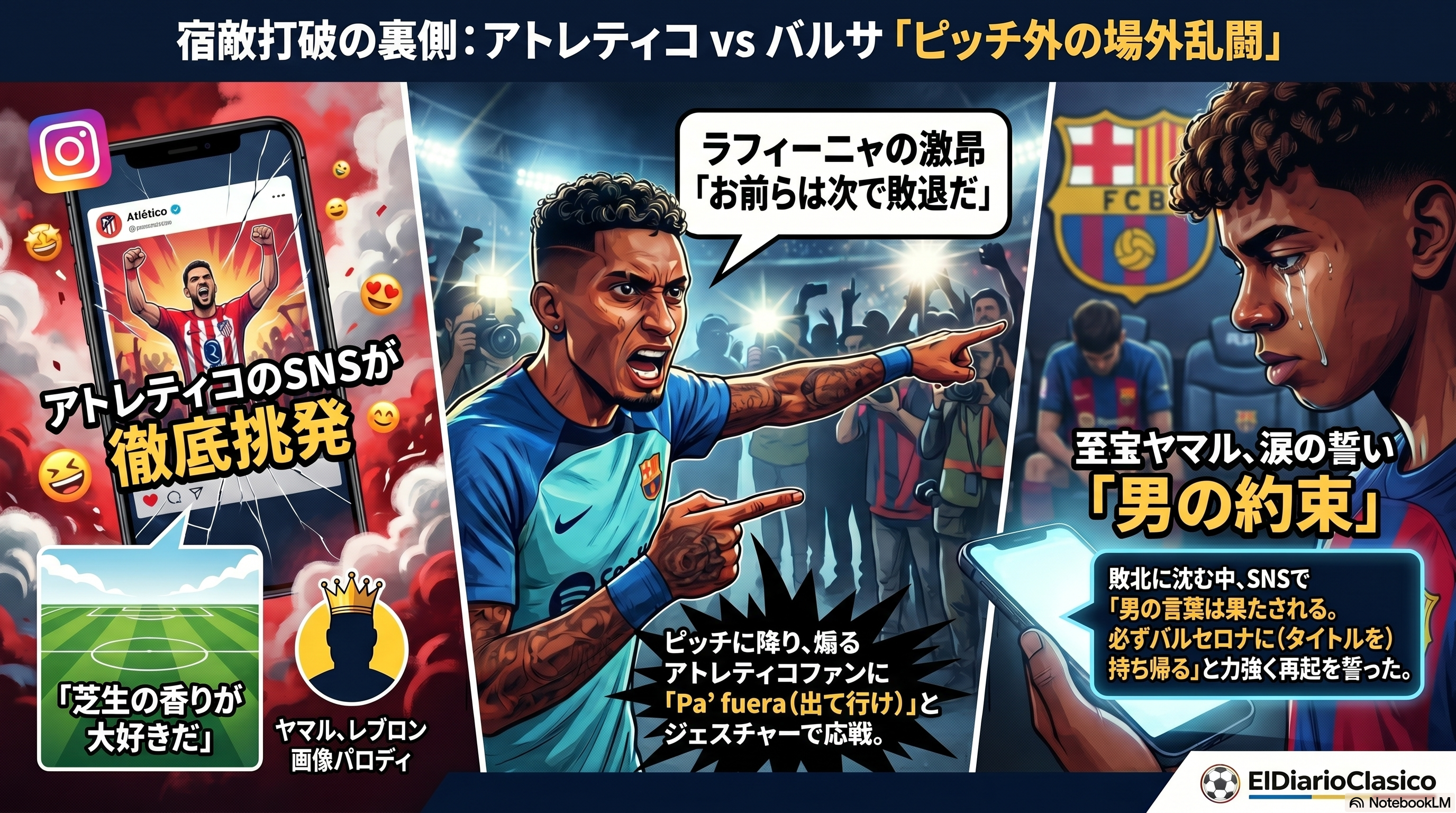 アトレティコのSNSによるバルセロナへの徹底的な挑発は、単なるライバル心の発露というより、クラブのアイデンティティを再確認し、サポーターの結束を強めるための戦略的な一手と捉えられます。敗戦後のラフィーニャ選手の激しい怒りや、ヤマル選手の若さながらの決意表明は、バルセロナ内部の複雑な感情を映し出しています。一方で、グリーズマン選手が試合後もチームを鼓舞し続けた姿は、クラブの精神的支柱としての存在感を示しており、こうした選手たちの振る舞いが、クラブ全体の空気感やサポーターの感情に大きく影響を与えていると言えるでしょう。