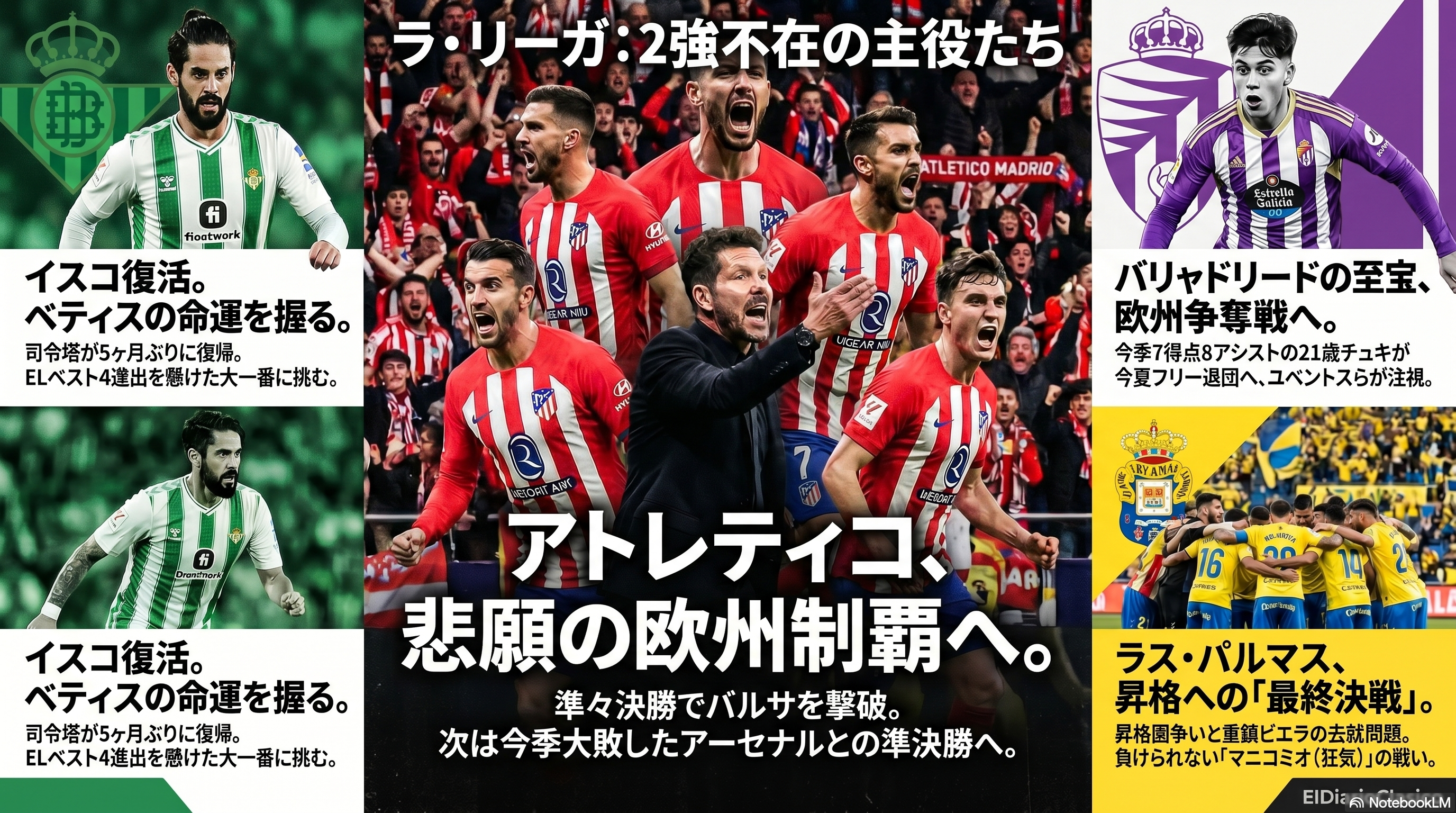 ラ・リーガ勢は欧州の舞台で凄まじい熱量を見せている。アトレティコ・マドリードがチャンピオンズリーグで堂々のベスト4進出を果たし、ベティスやラージョもそれぞれのコンペティションで次なるステージへの切符を懸けて死闘を繰り広げている。一方で国内に目を向ければ、ビジャレアルの歴史的な記録更新への挑戦や、2部での熾烈な昇格・残留争いが佳境を迎えており、どのクラブもシーズン終盤に向けた「決勝戦」を戦い抜いている。コパ・デル・レイ決勝という大一番も控え、スペインサッカーの熱狂は最高潮に達している。