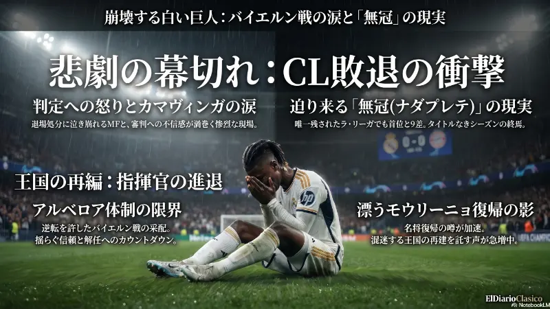 CL敗退と無冠が濃厚となり危機的状況にあるレアル・マドリード。カマヴィンガの涙や大型補強の失敗、W杯を見据えた主力たちのモチベーション低下など、アルベロア監督は四面楚歌の状態で解任の危機に瀕しています。一方でリュディガーへの契約延長オファーや、リヨンで大活躍するエンドリッキの帰還、そしてモウリーニョ招致の噂など、すでに来季に向けた変革の足音が聞こえ始めています。