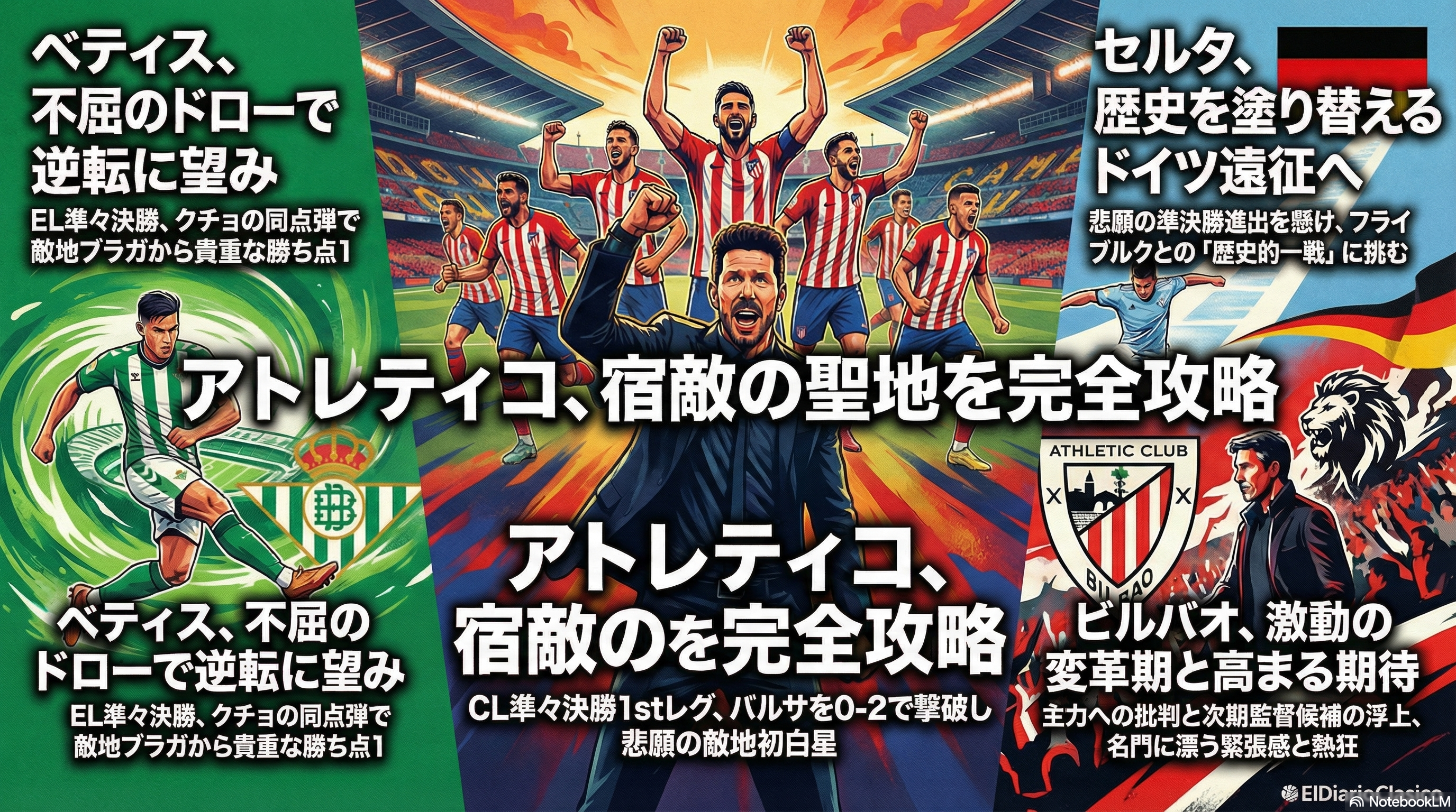 本日のラ・リーガ勢は欧州の舞台で大きな明暗が分かれました。アトレティコ・マドリードがカンプ・ノウで歴史的な勝利を収めてCLベスト4進出へ大きく前進した一方で、ヨーロッパリーグを戦うベティスは敵地で価値あるドローをもぎ取り、セルタも次戦へ向けた強い決意を見せています。国内リーグに目を向けると、アスレティック・ビルバオの次期監督人事やエスパニョールのダービーへの意気込み、さらにはセビージャやバレンシアの長引く低迷に対する厳しい視線など、シーズン終盤に向けて各クラブの思惑が激しく交錯しています。また、ビジャレアルの選手が巻き込まれた密輸疑惑などピッチ外のニュースも大きく取り上げられた一日となりました。